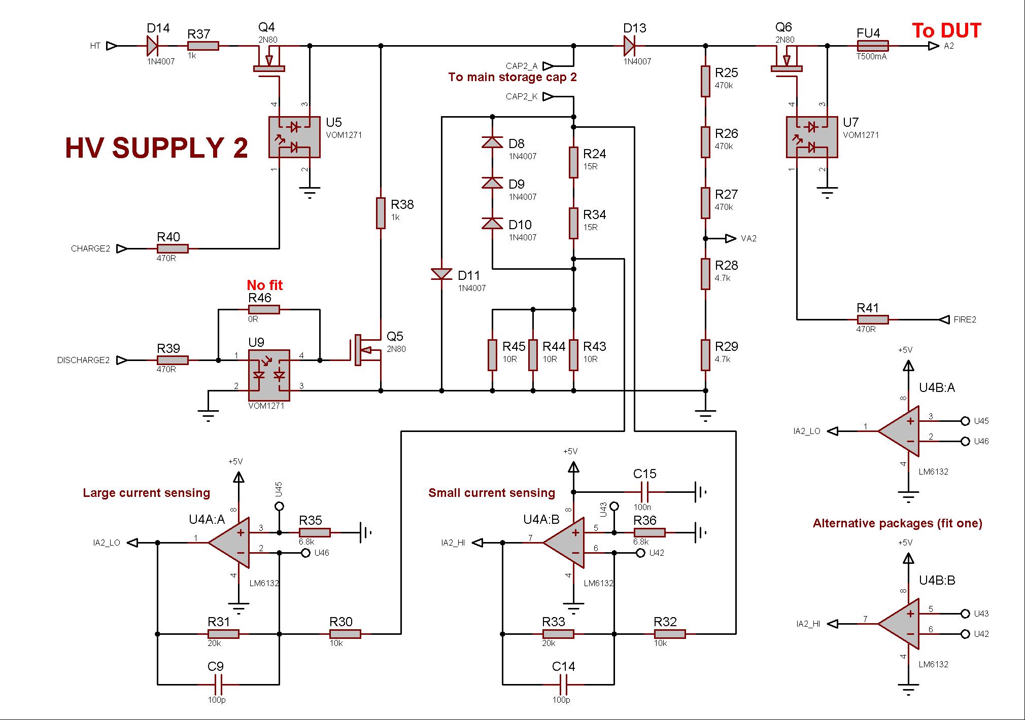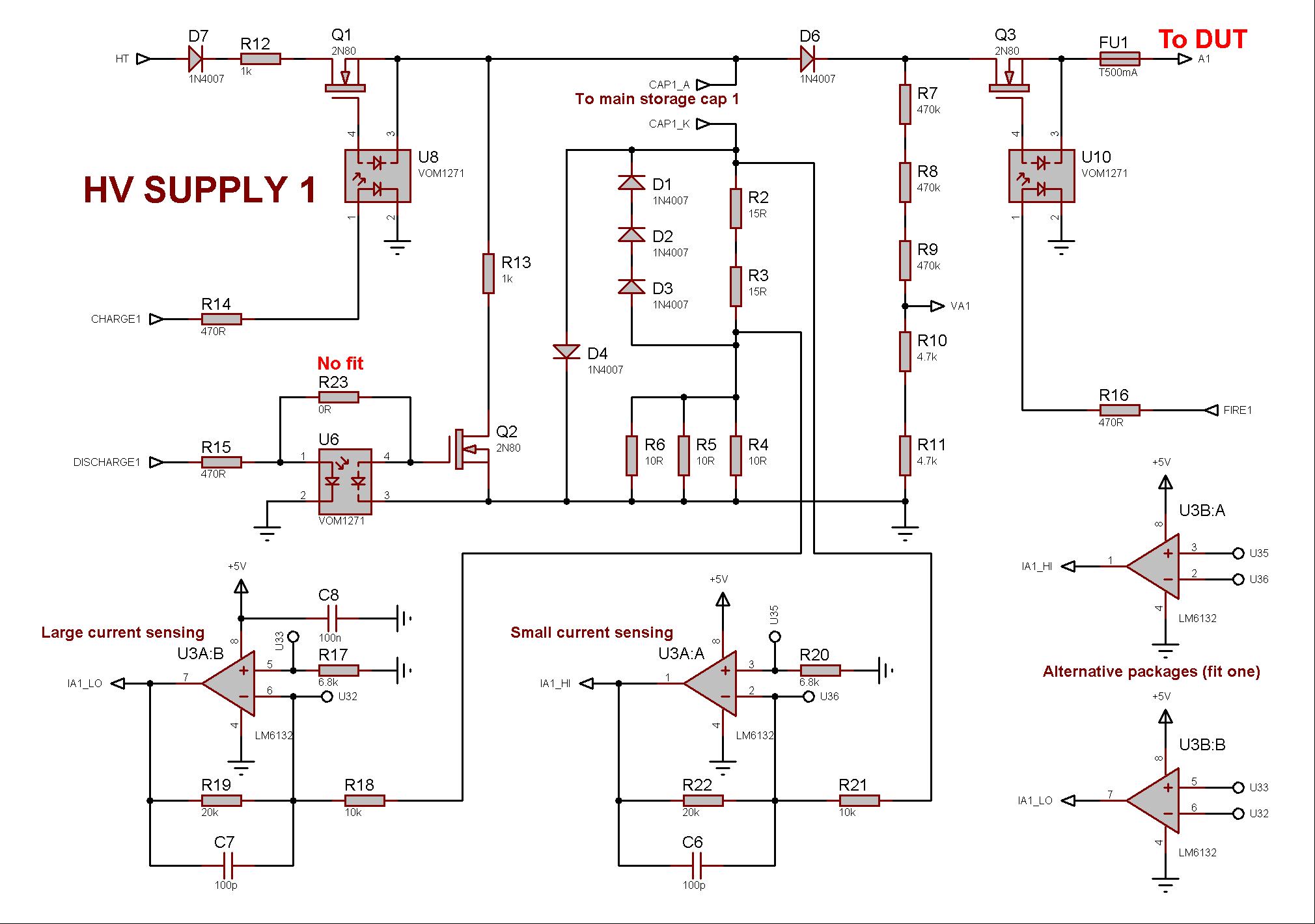 Once the voltages are ready, the 'fire' MOSFET Q3 is turned on, which connects the storage capacitance across the DUT.